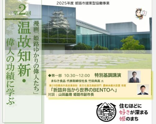 オープニング 特別基調講演「折詰弁当から世界のBENTOへ」 まねき食品 代表取締役社長 竹田典高 氏 対 談 「まねき食品」代表取締役社長 竹田典高 氏 × 山田基靖 姫路市副市長 ファシリテータ Socia … 続きを読む 第2回温故知新・偉人の功績に学ぶ「特別基調講演」